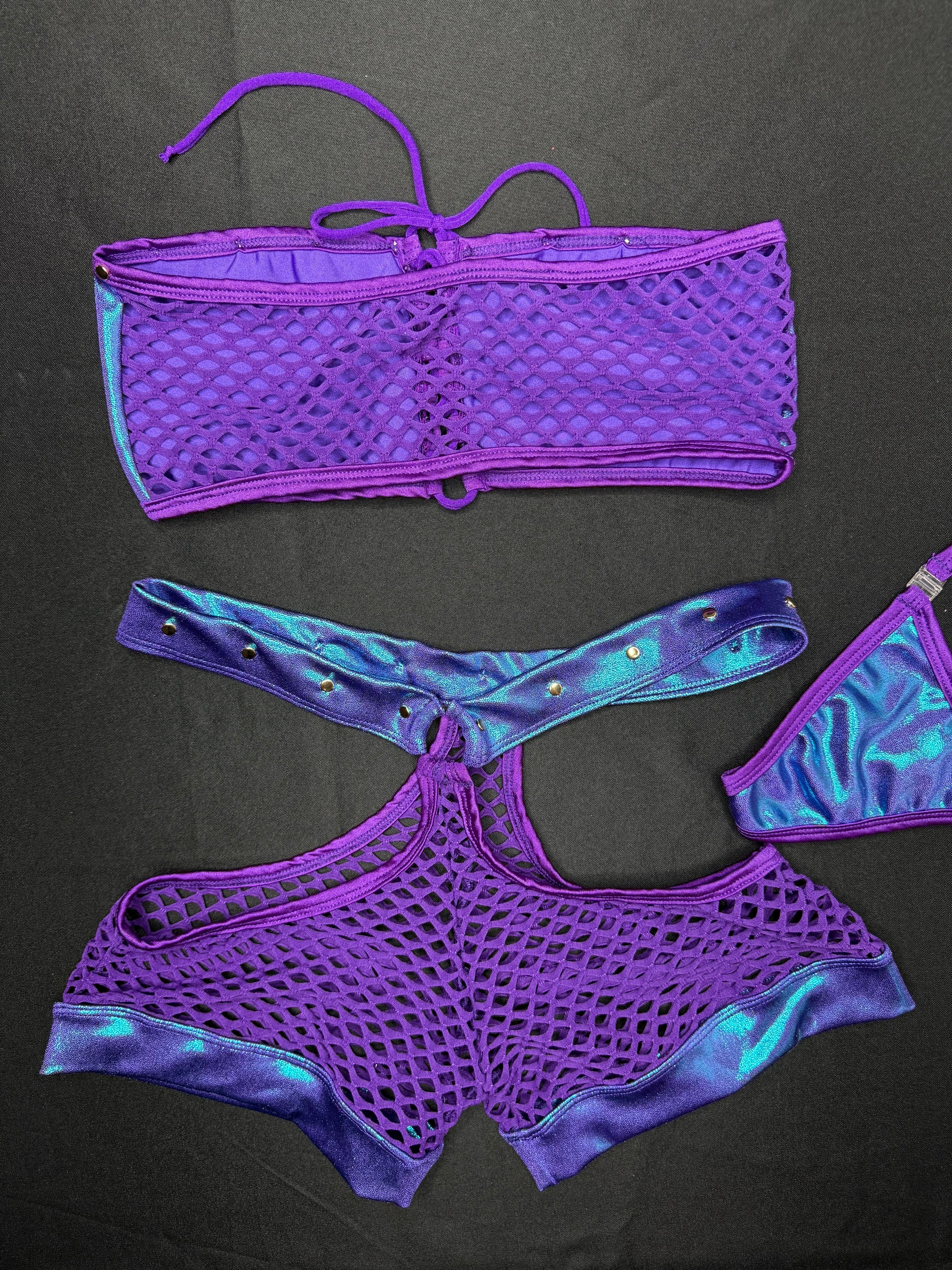 Metallic Purple/Purple Fishnet Spandex Tube Top/Shorts Two-Piece Lingerie Outfit