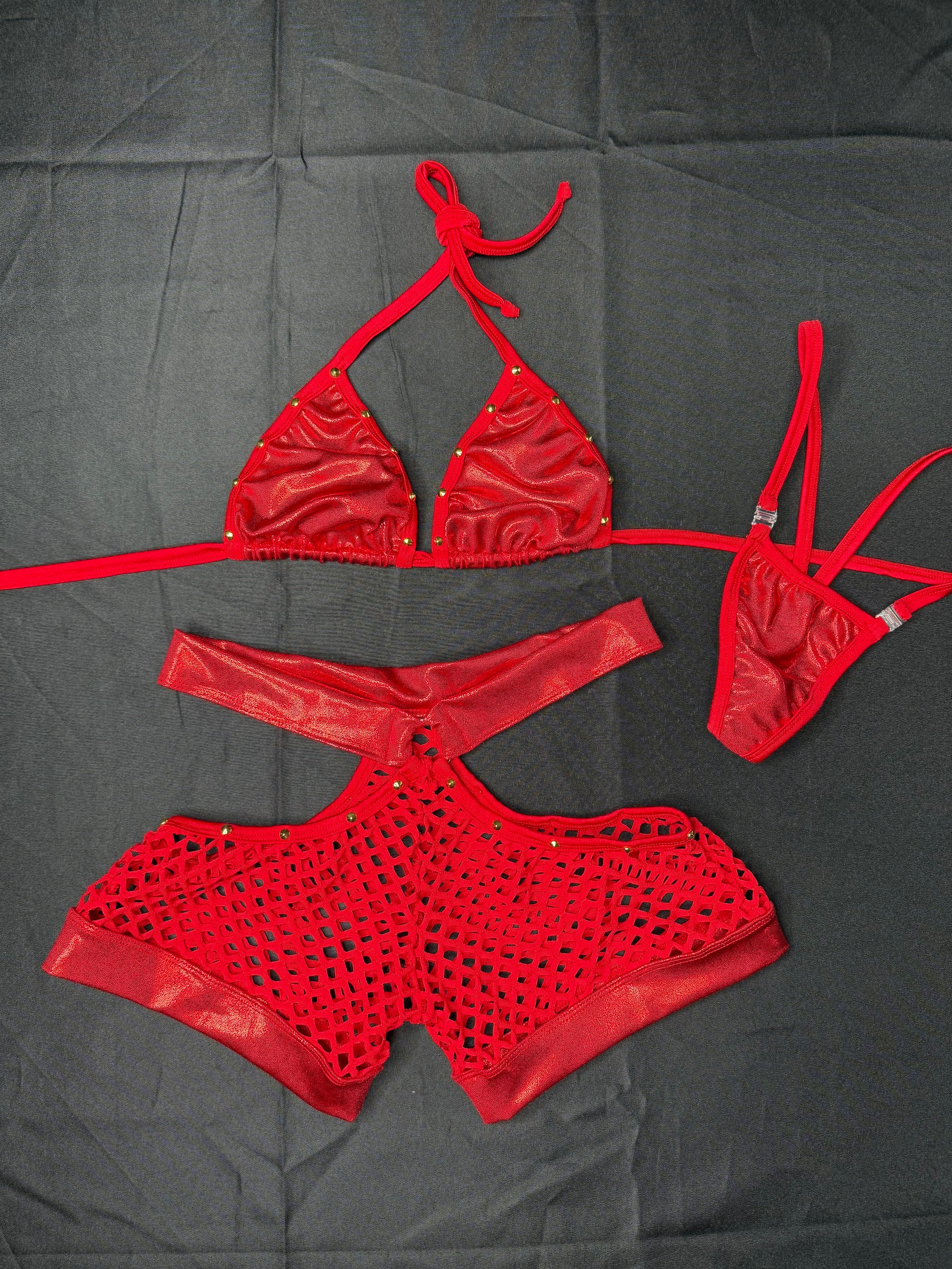 Metallic Red Spandex Bikini Top/Shorts Two-Piece Lingerie Outfit