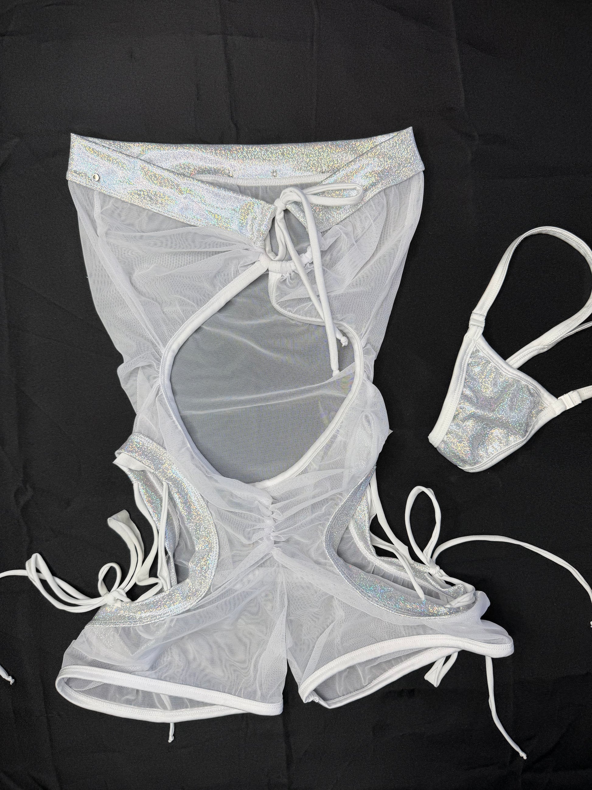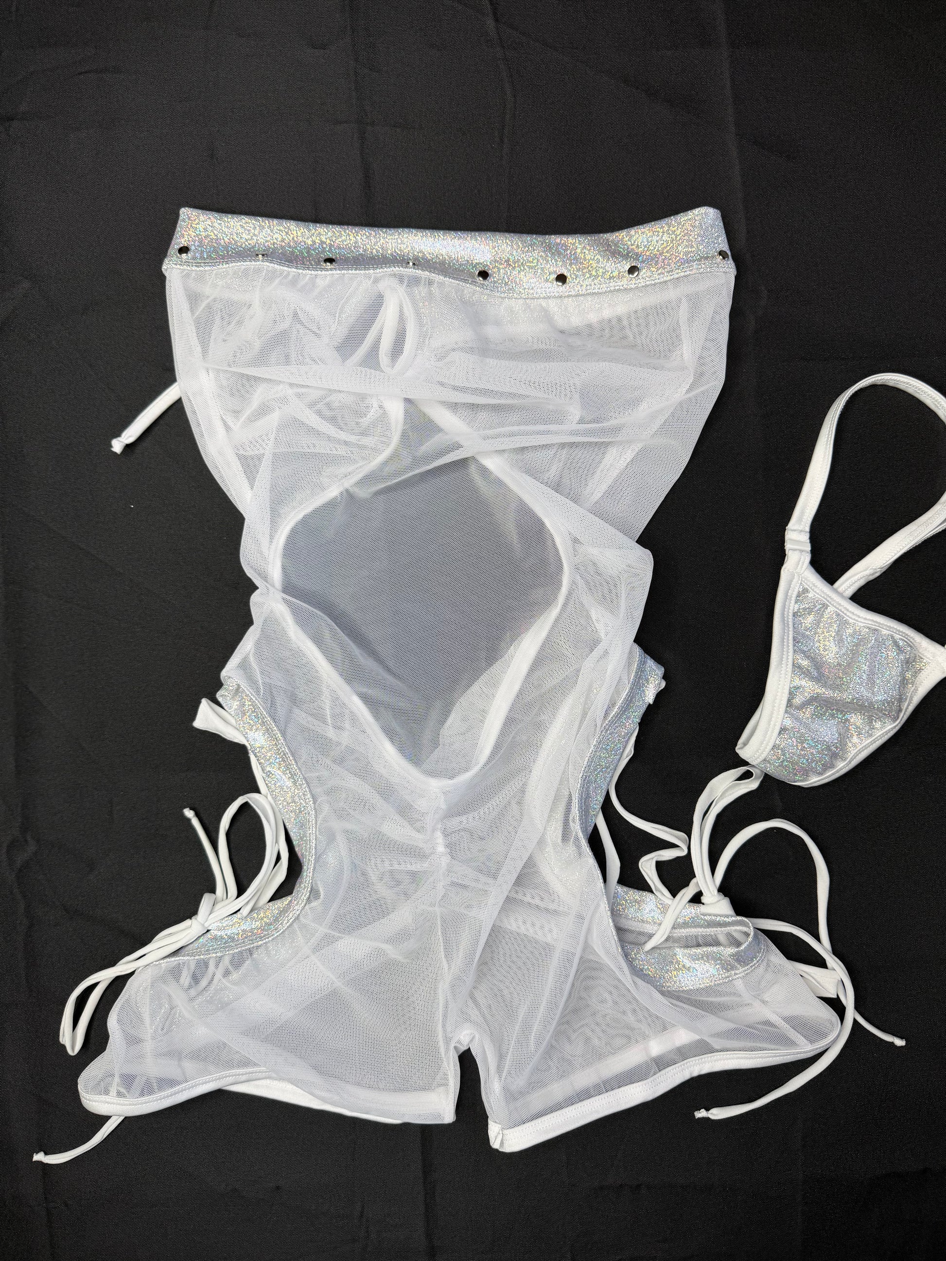 Metallic Silver Spandex/White Mesh One-Piece Lingerie Outfit