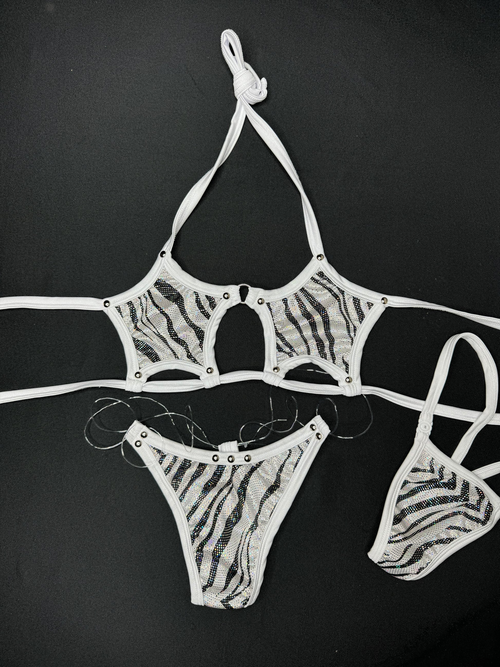 Metallic White Tiger Print Two-Piece Star Top Bikini Lingerie Outfit