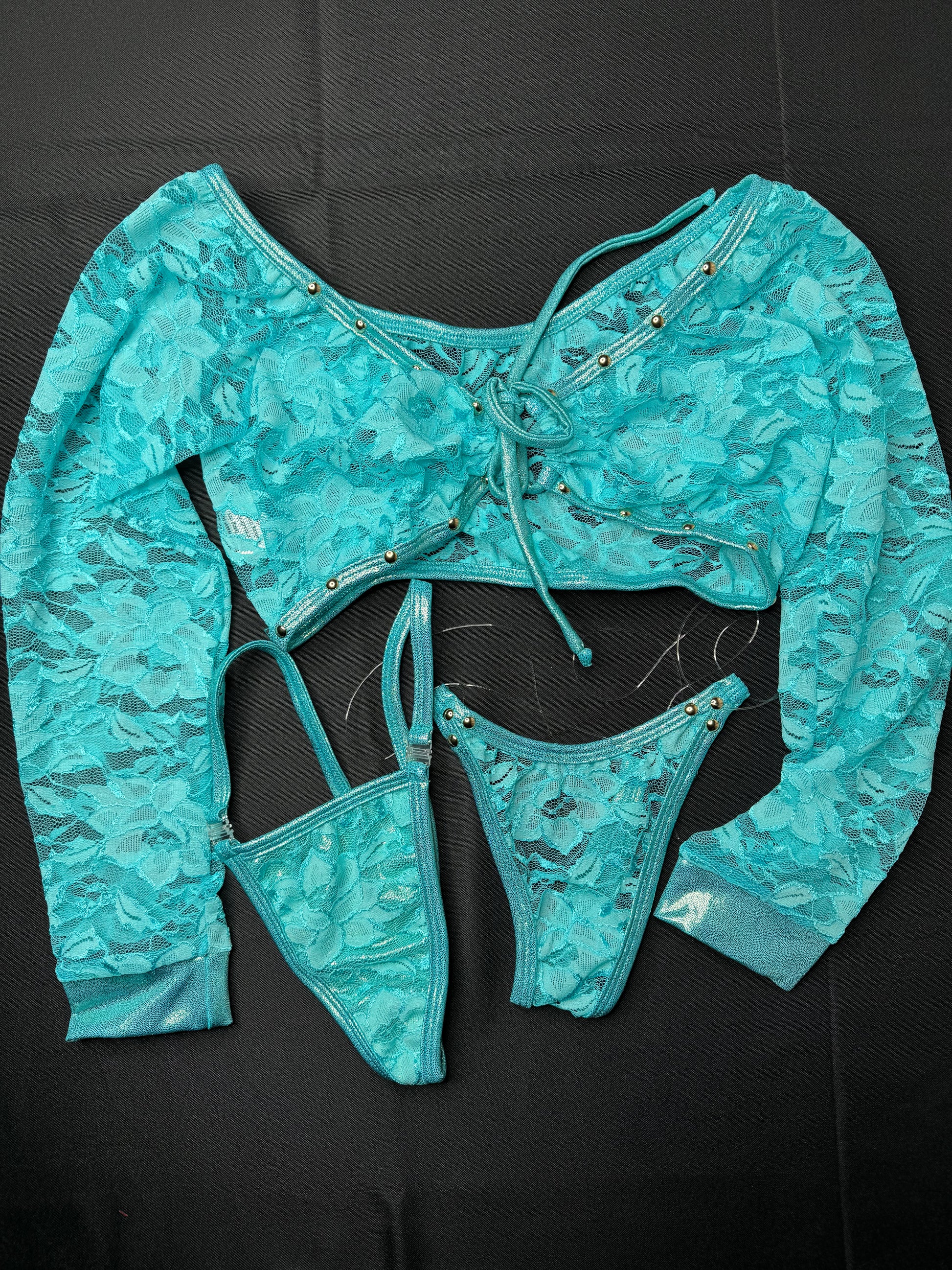 Metallic Mint/Mint Flower Pattern Lace Two-Piece Exotic Dancer Outfit
