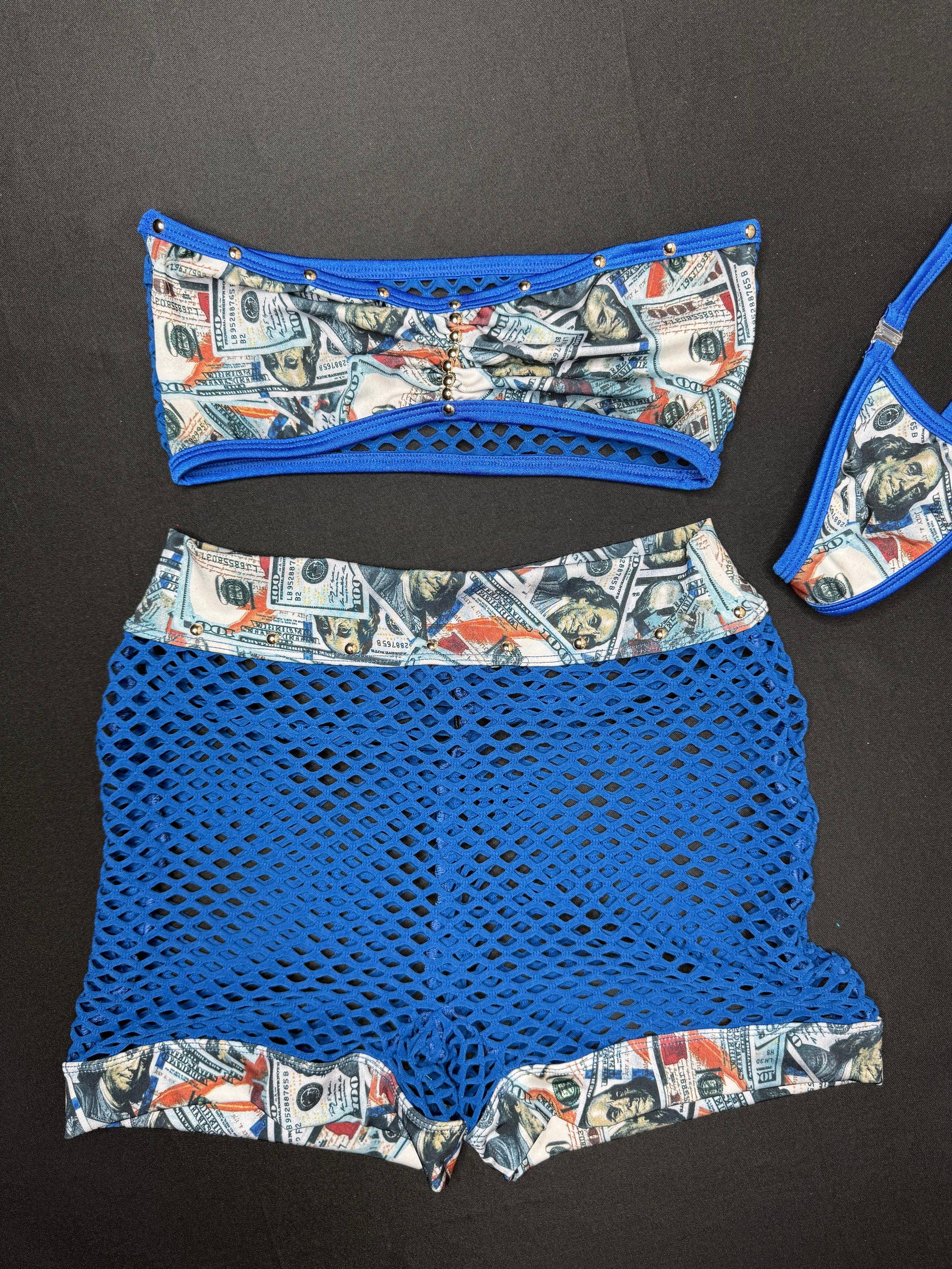 Money Print Blue Fishnet Tube Top/Fishnet Shorts Lingerie Outfit