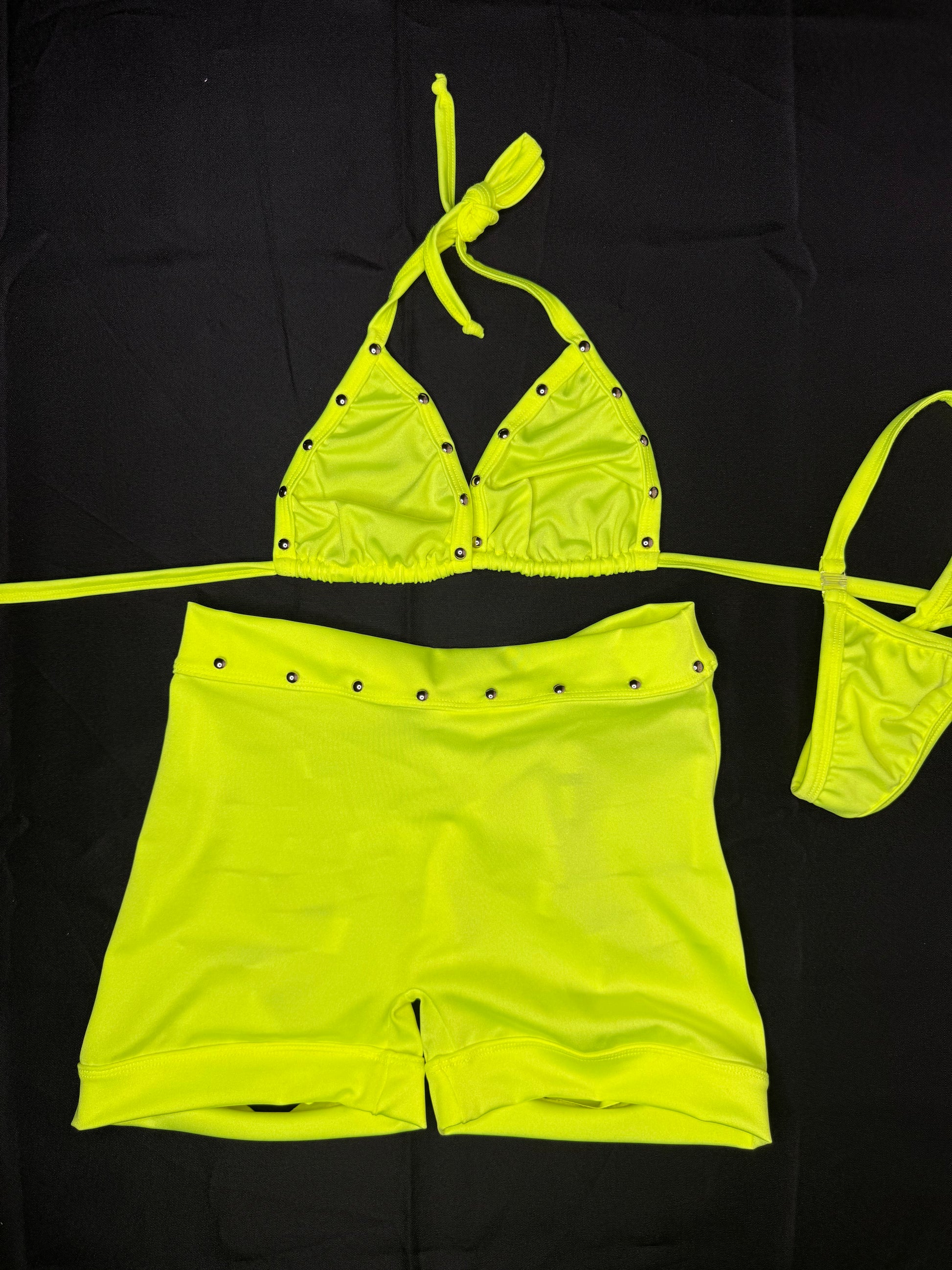 Neon Yellow Spandex Two-Piece Ripped Shorts Lingerie Outfit