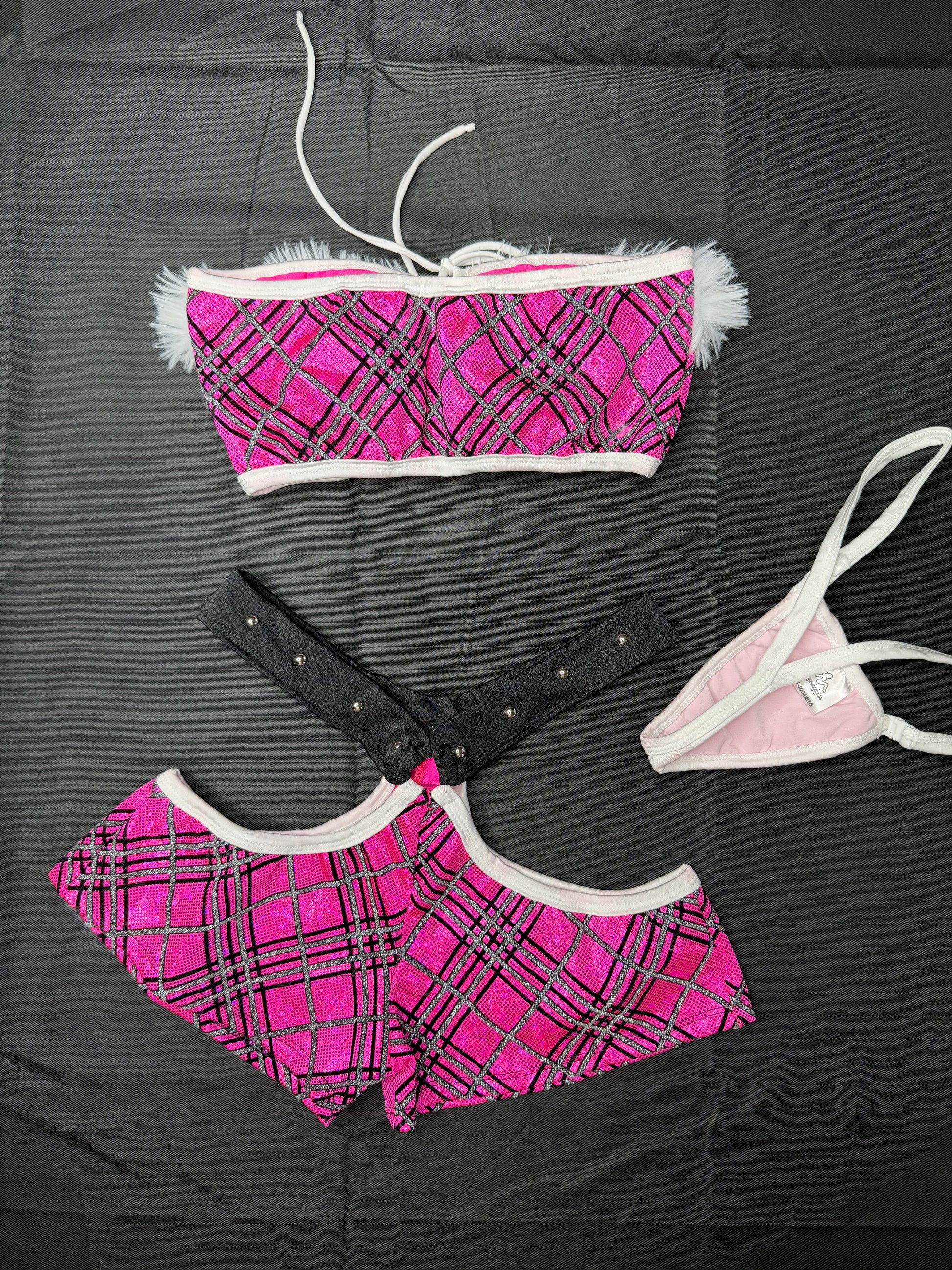 Pink Plaid Spandex/White Fur Two-Piece Tube Top/Shorts Lingerie Outfit