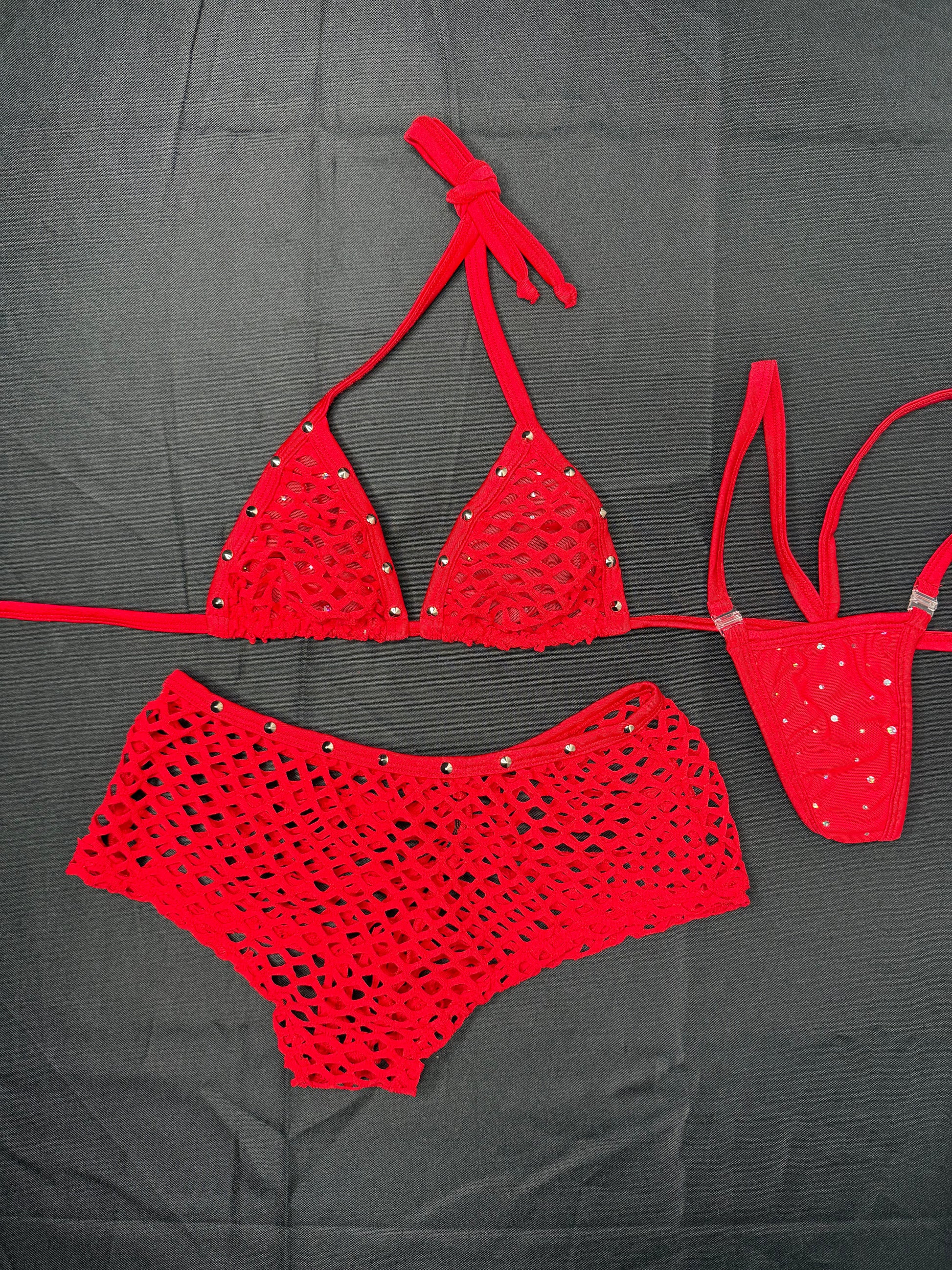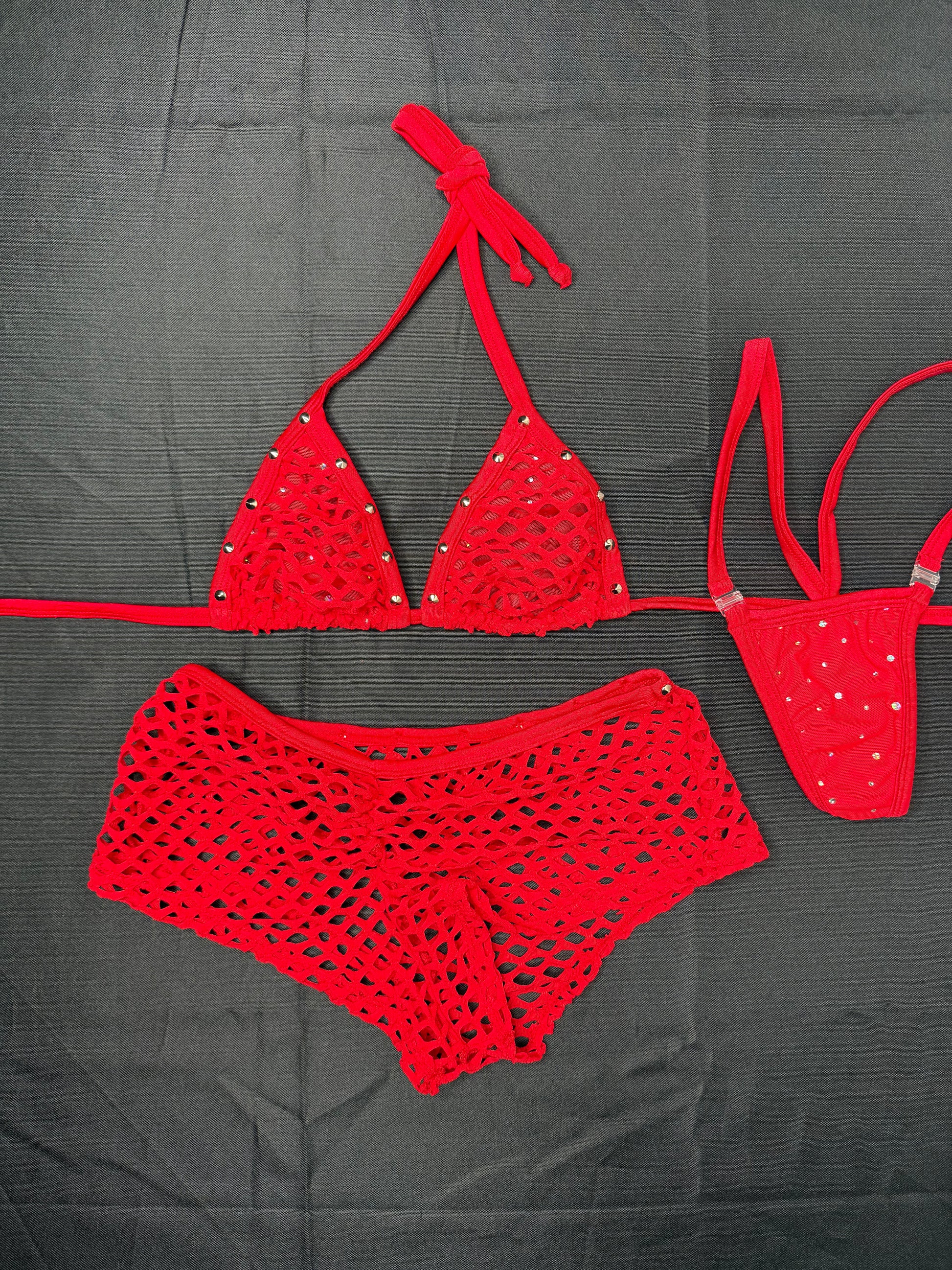 Red Fishnet Spandex Bikini Top/Shorts Two-Piece Lingerie Outfit