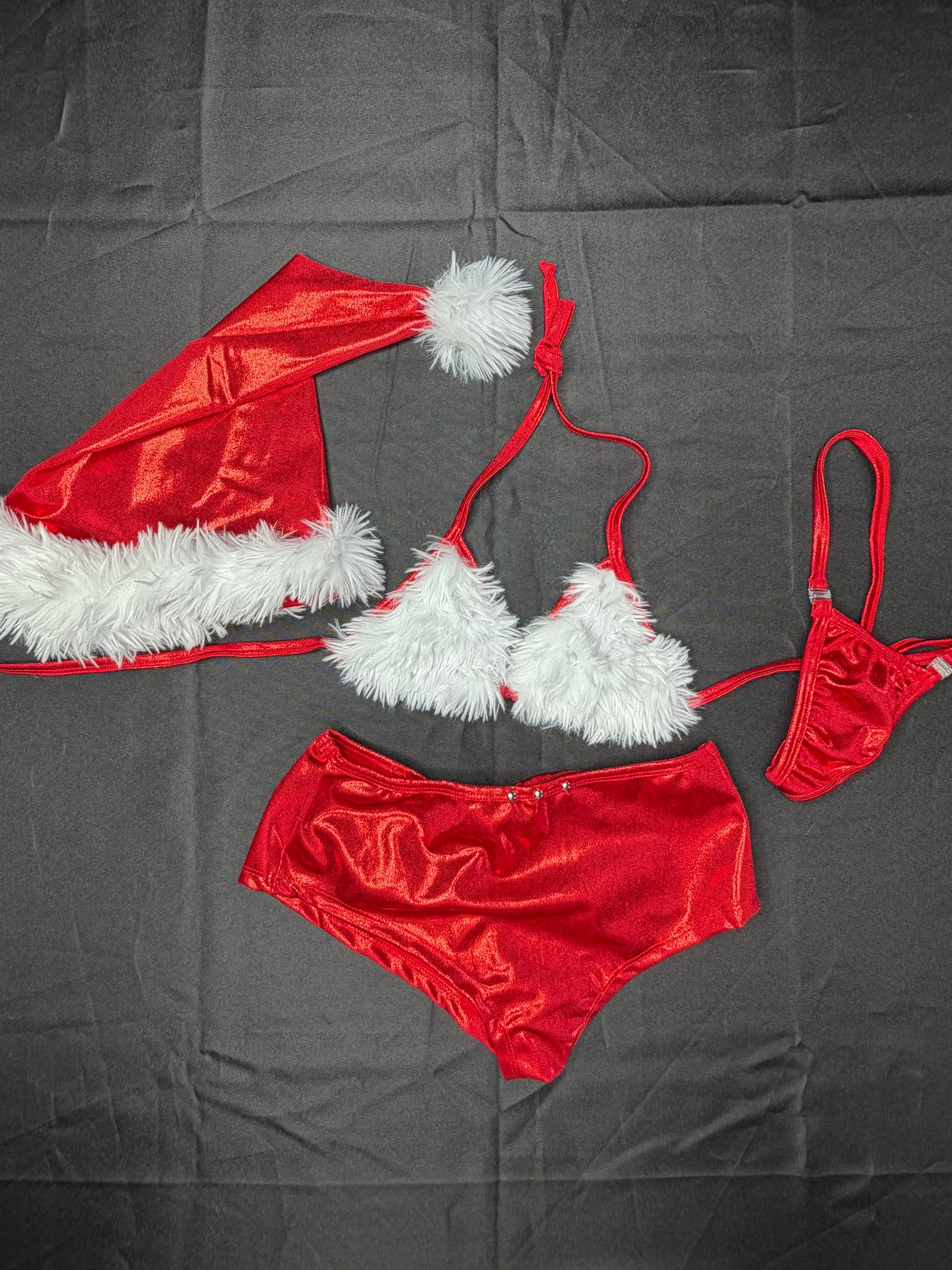 Red Metallic Spandex/White Fur Three-Piece Shorts/Bikini Top with Hat