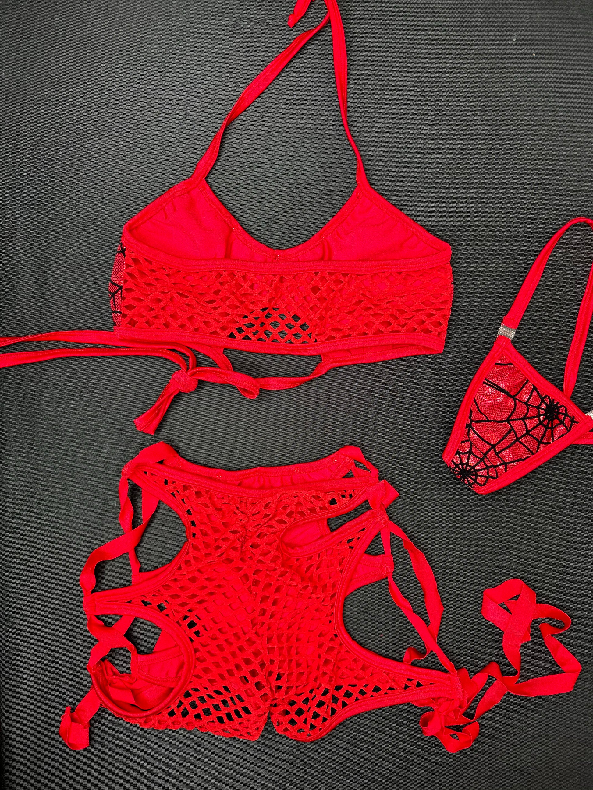 Red Web/Red Fishnet Sports Bra/Shorts Two-Piece Lingerie Outfit