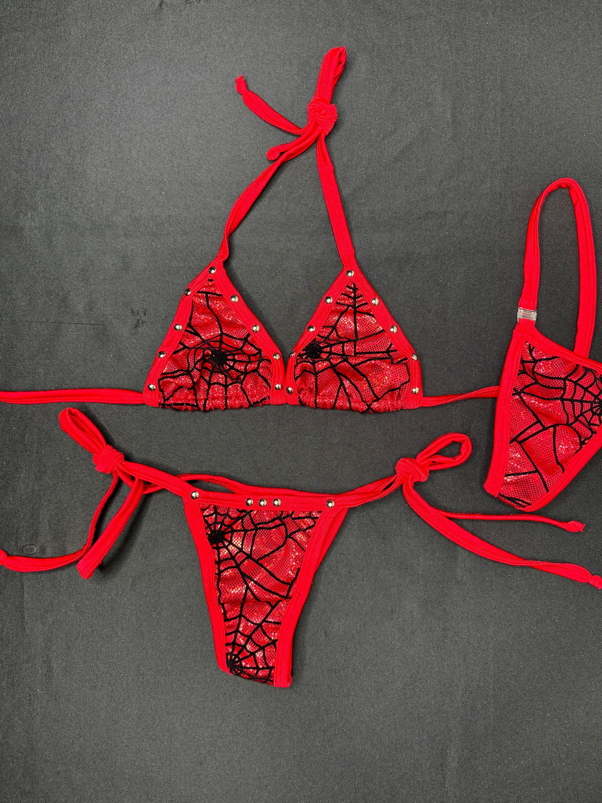 Red Web Two-Piece Side-Tie Bikini Lingerie Outfit