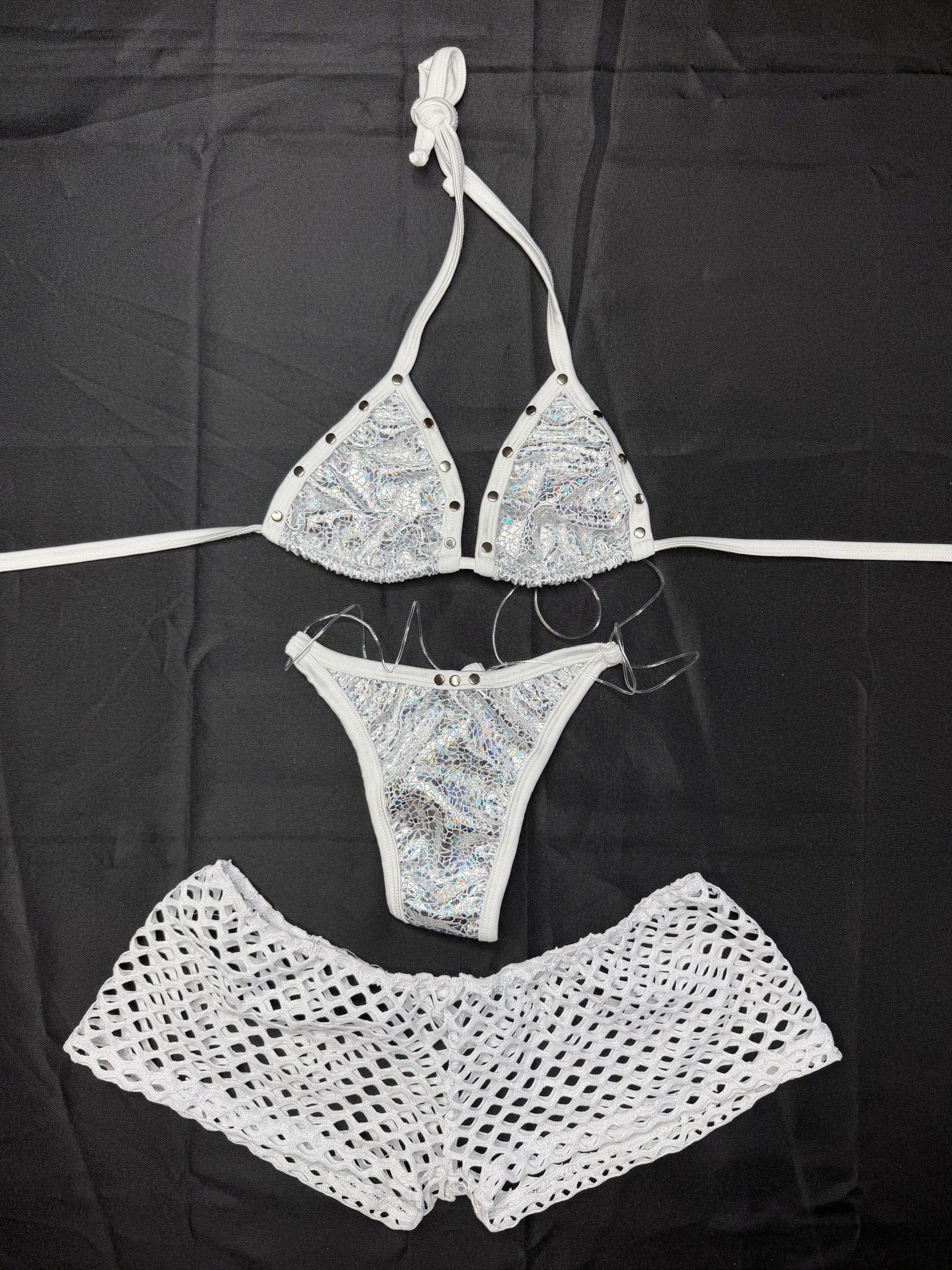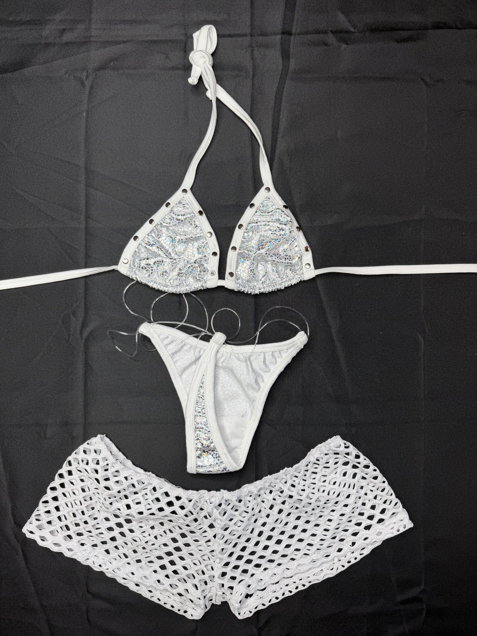 Silver/White Spandex Bikini/Shorts Three-Piece Lingerie Outfit