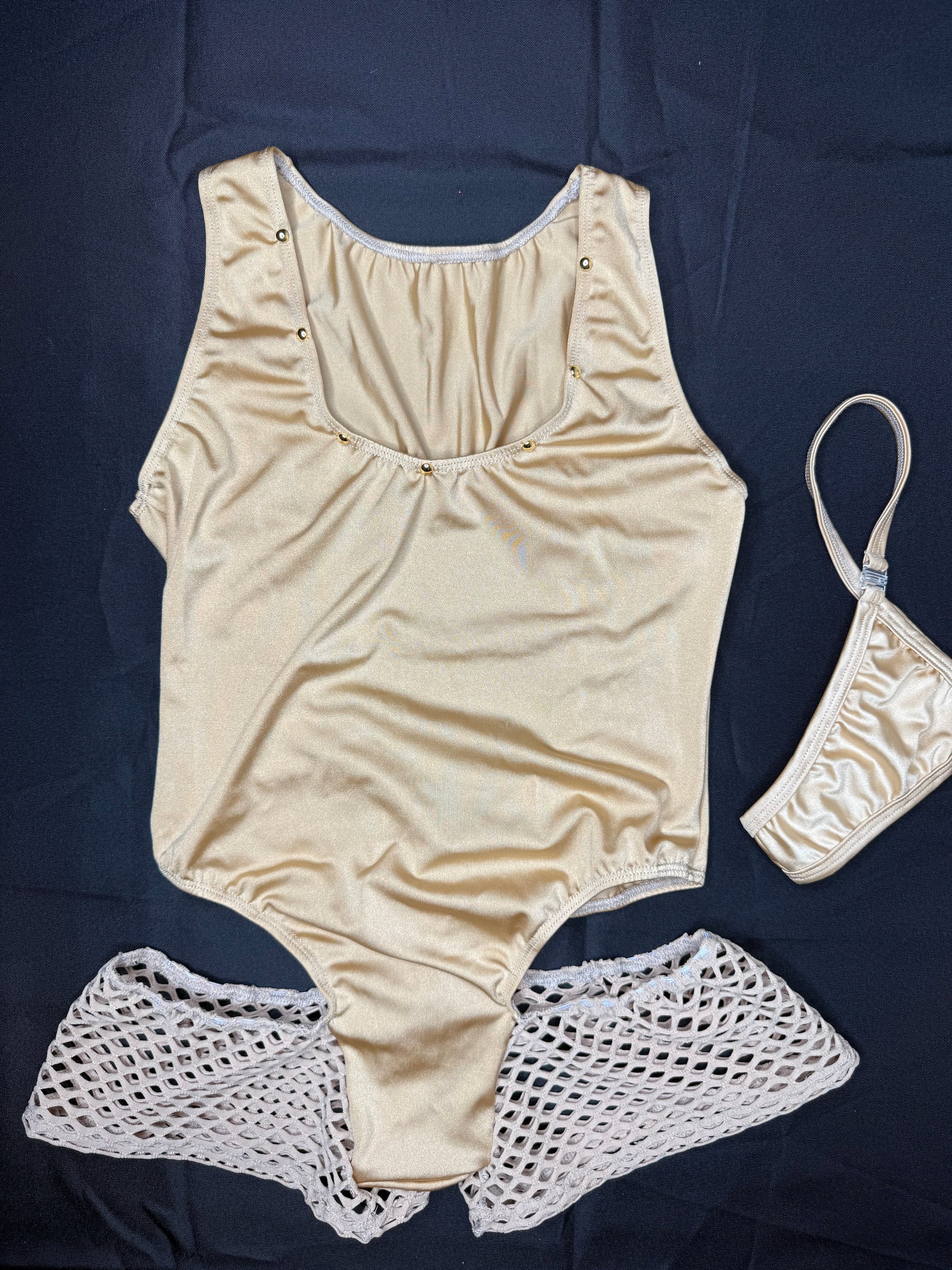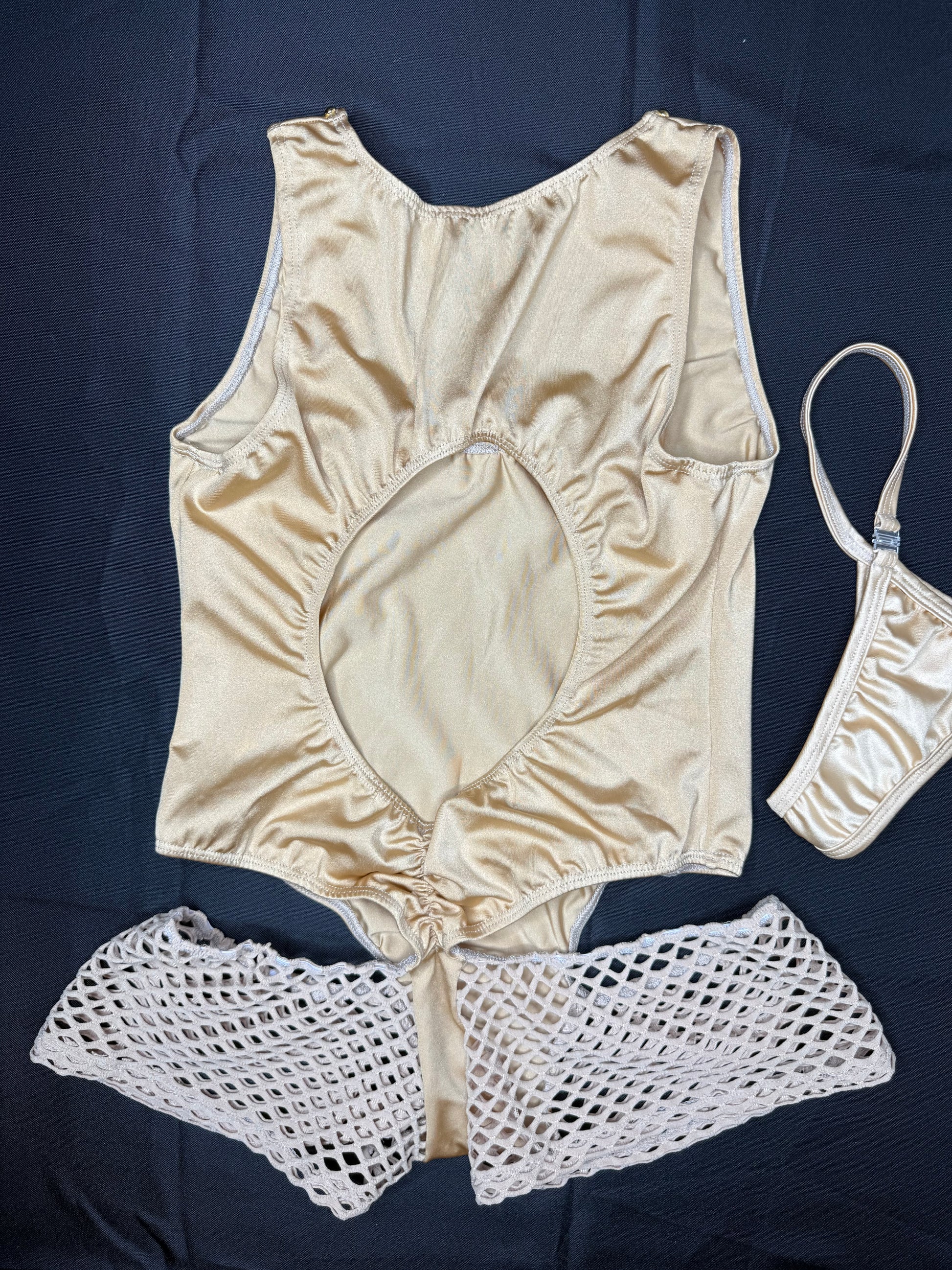 Tan Fishnet Spandex One-Piece Romper Lingerie Outfit