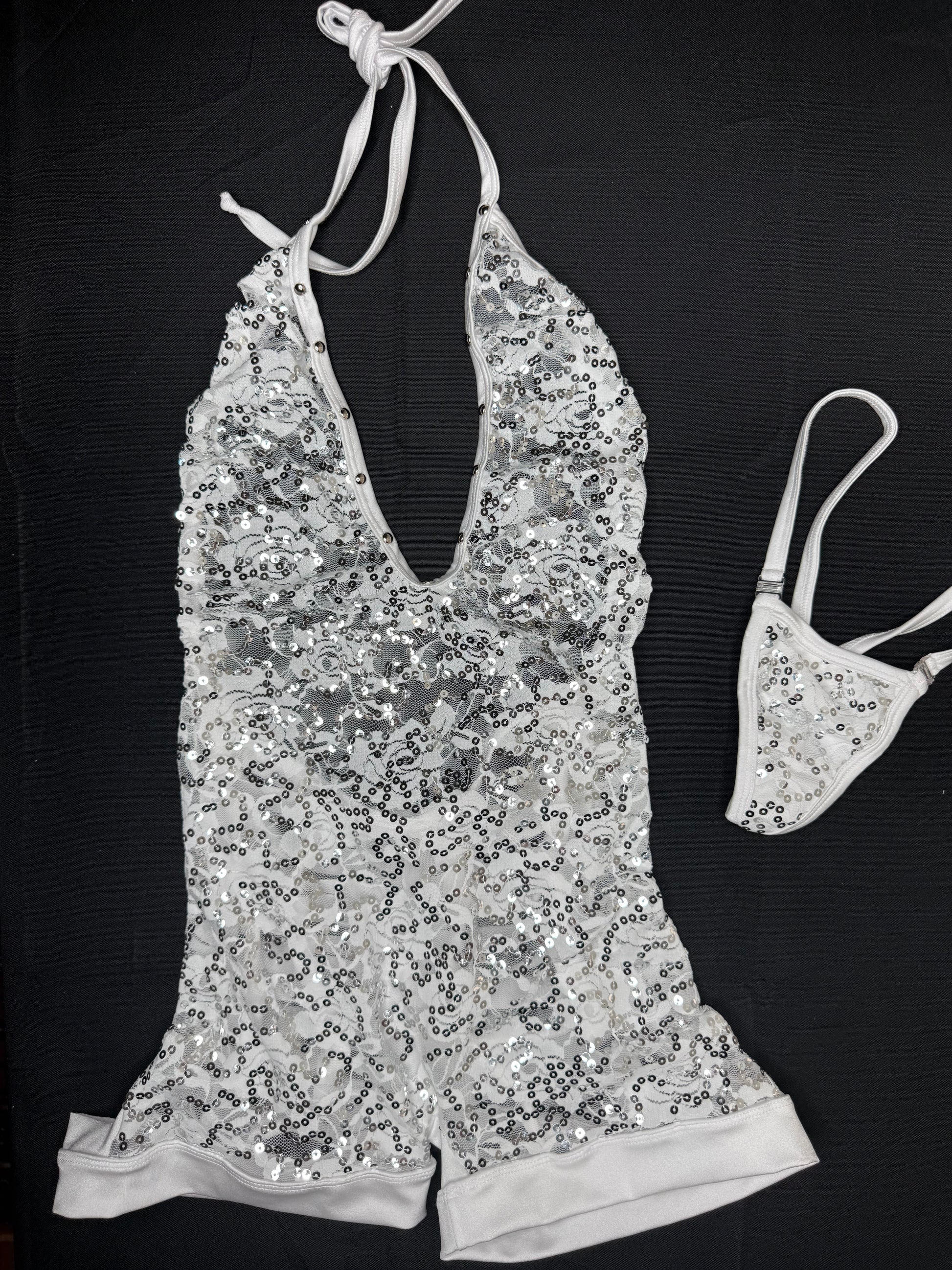 White Lace Sequins One-Piece Ripped Back Lingerie Outfit